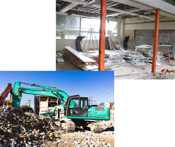 内装解体・原状回復・スケルトン工事など、次工程を見据えた計画的な解体を行います。 不用品回収や整地まで一貫対応し、スムーズな現場進行をサポートします。
